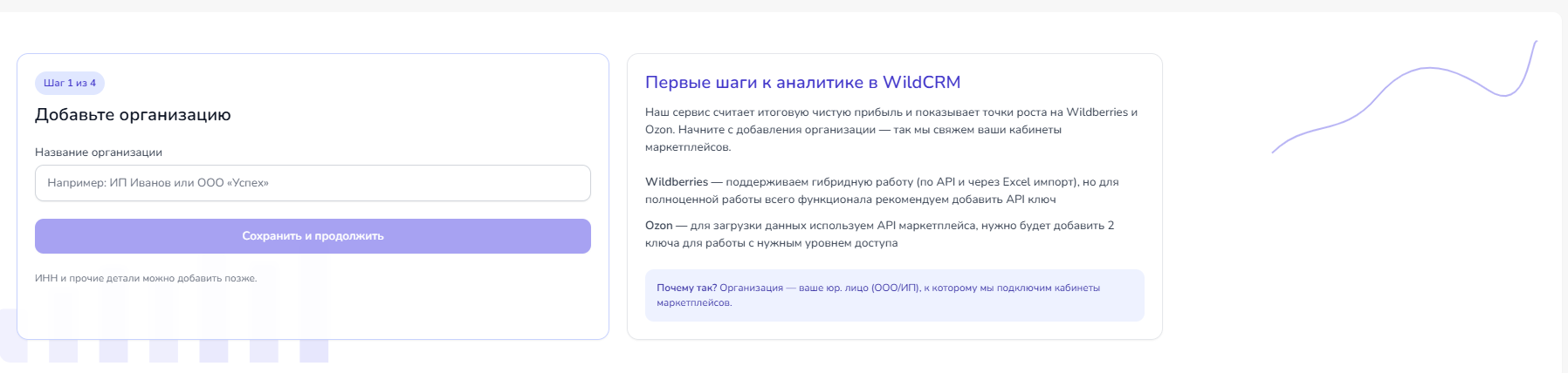 После авторизации в системе вы попадете на стартовую страницу, где будет предложено добавить первый кабинет поставщика.