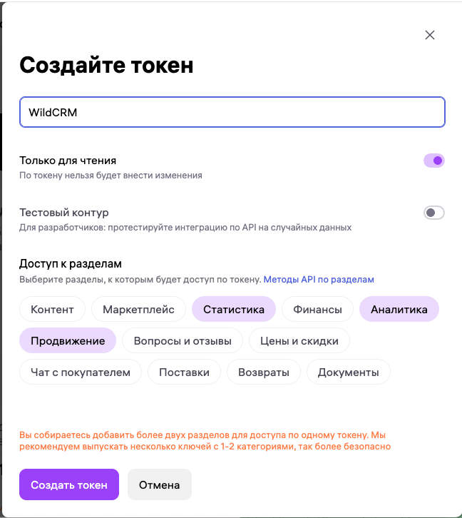 ВБ могут показать уведомления о безопасности, его игнорируем. Иначе придется создавать несколько ключей, а в кабинете можно создать максимум 20 штук.