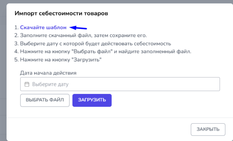 В разделе "Базовая себестоимость" нажмите значок скачивания "Список товаров без себестоимости"