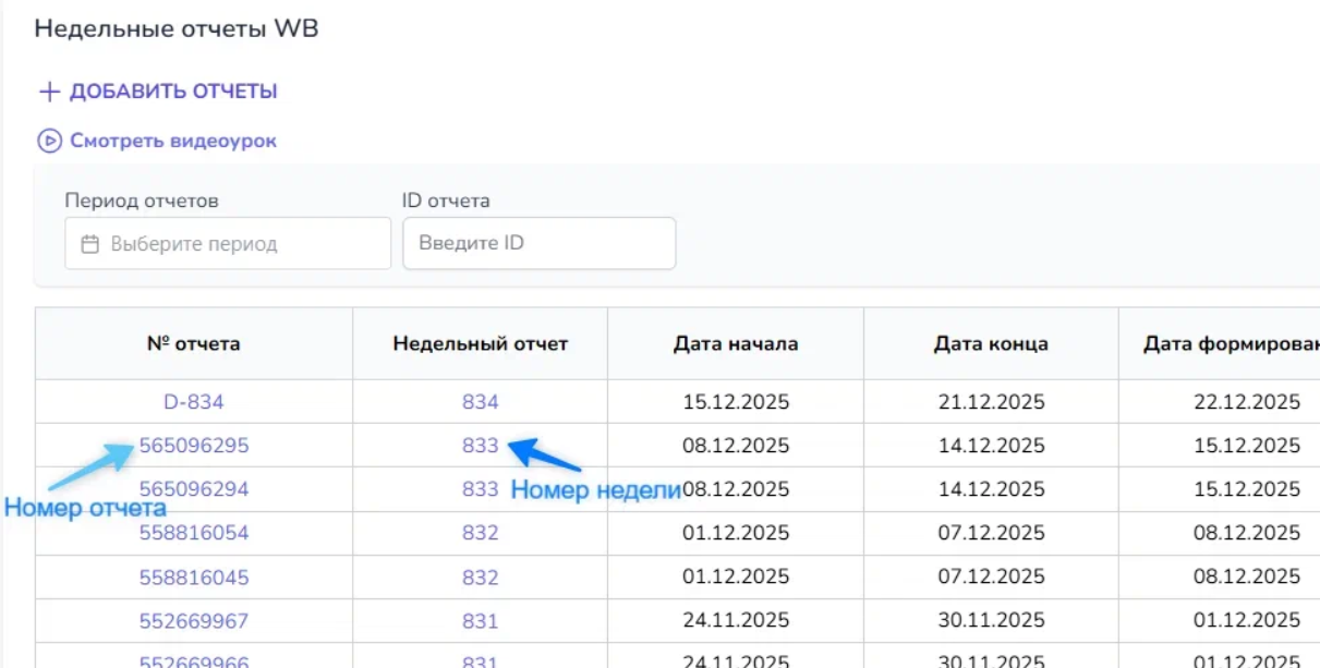 Если ВБ прислал 2 отчета за неделю, вы можете посмотреть каждый их них, нажав на номер отчета.