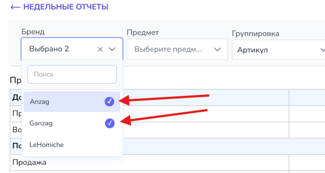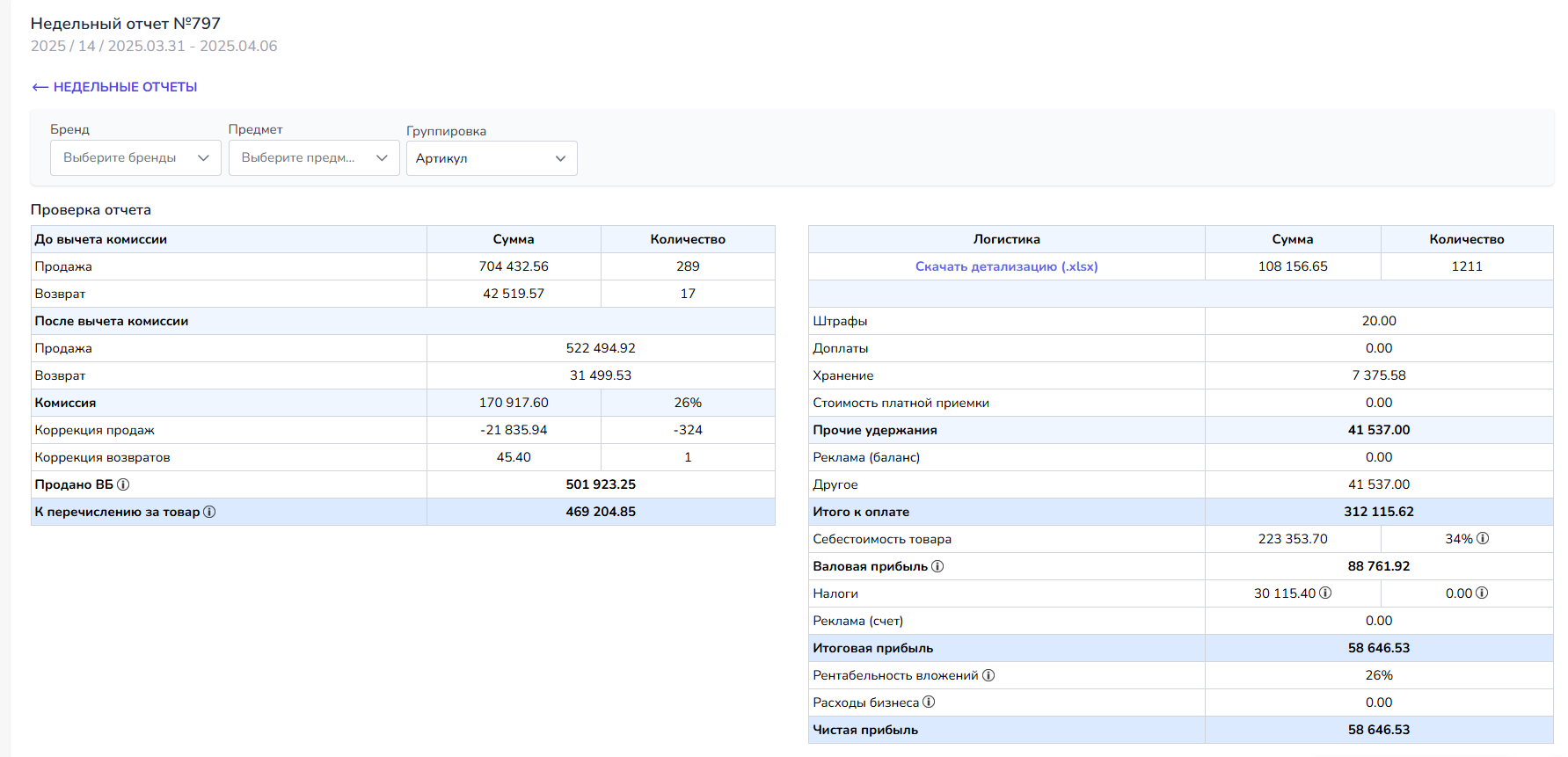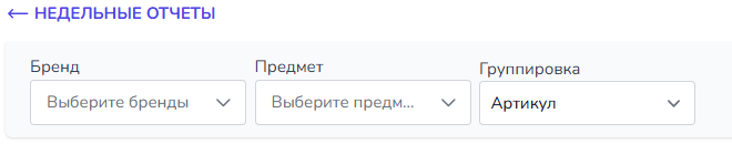 В недельном отчете вы можете отфильтровать финансовые данные по Брендам, Предметам, Группировке.