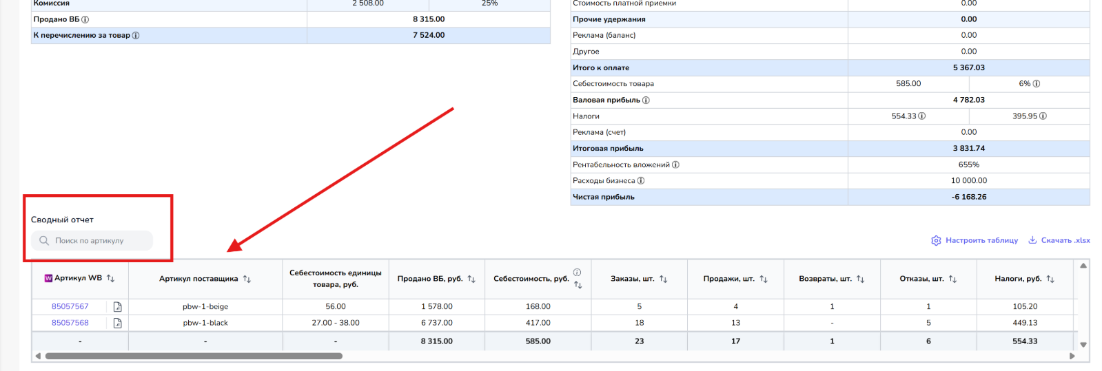 Под общим дашбордом расположен Сводный отчет, в котором вы можете увидеть финансовые расходы по каждому артикулу.
