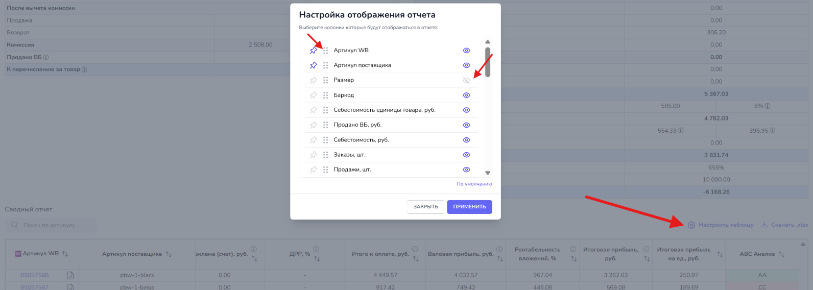📌 По кнопке "Настроить таблицу" вы сможете настроить сводный отчет под себя: