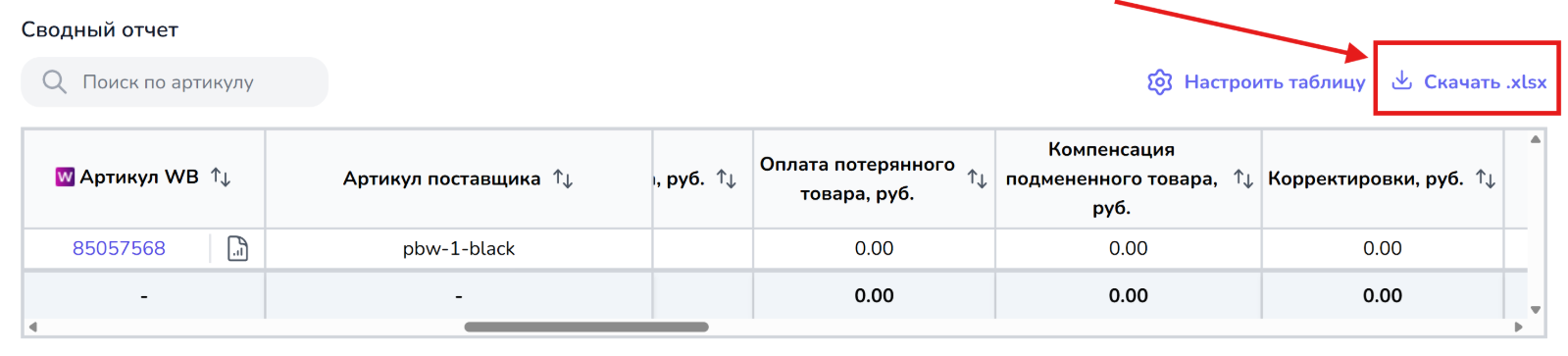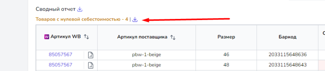 📌 Над сводной таблицей будет отображена информация об артикулах с нулевой себестоимостью. Вы можете скачать файл с этими артикулами, заполнить его и загрузить по инструкции.