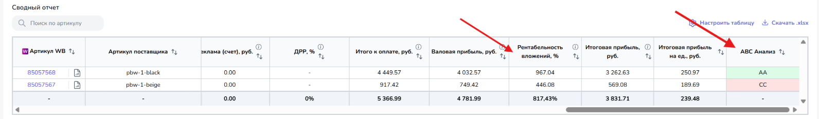 📌 В сводном отчете содержится основная информация по статьям бизнеса с детализацией по артикулу, в том числе рентаблельноcть и ABC-анализ (самый правый столбец).