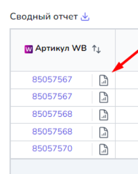 📌 Из сводного отчета вы можете перейти в раздел с unit-экономикой по каждому артикулу, нажав на ярлык рядом с артикулом WB.