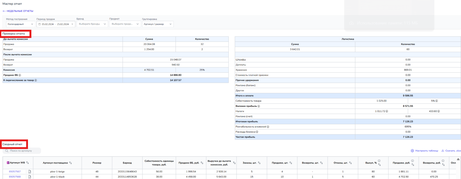 В Сводном отчете показан финансовый результат по каждому вашему артикулу, который участвовал в продажах за указанный период в поле "Период продаж".