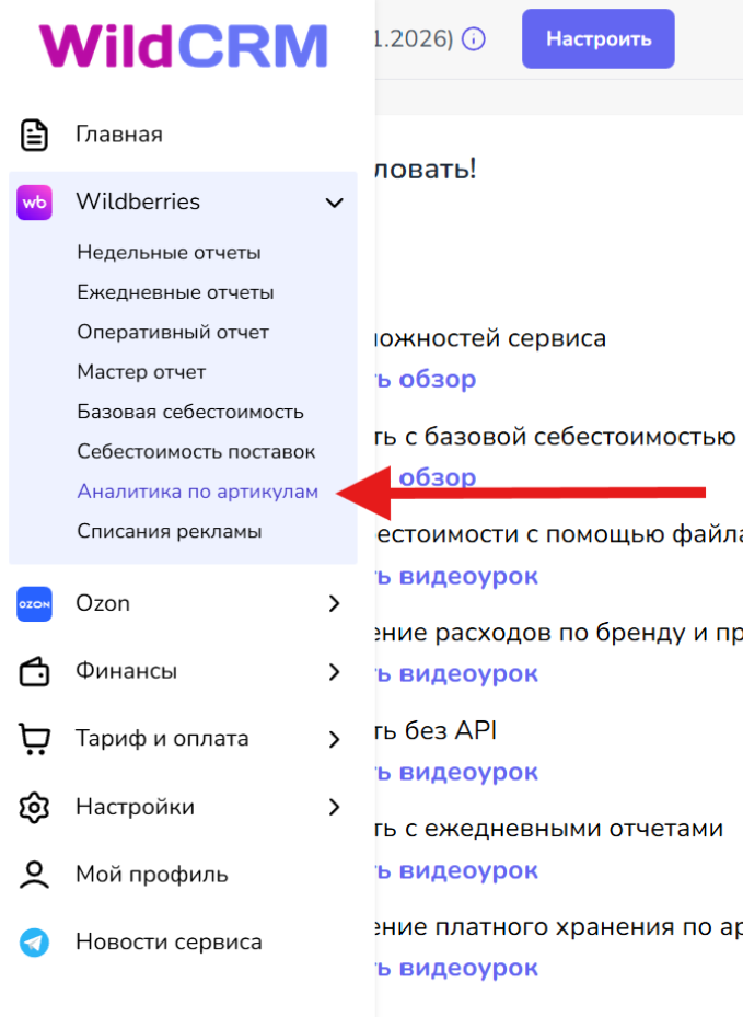 Раздел "Аналитика по артикулам" доступен в тарифах "Аналитик" и "Эксперт".