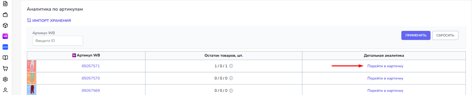 В разделе "Аналитика по артикулам" отображены артикулы WB и данные по их остаткам.