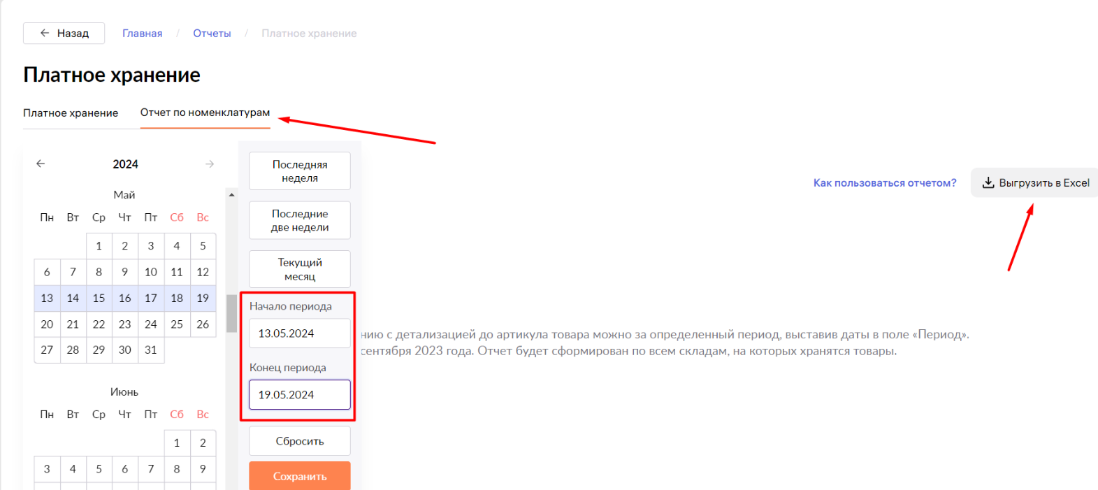 3. Выберите период, за который вы хотите сформировать отчет о платном хранении.