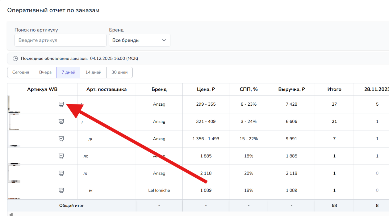 Чтобы посмотреть детализацию по артикулу за период, нажмите на значок "графика" возле Артикула WB. Откроется карточка артикула с расширенной аналитикой.