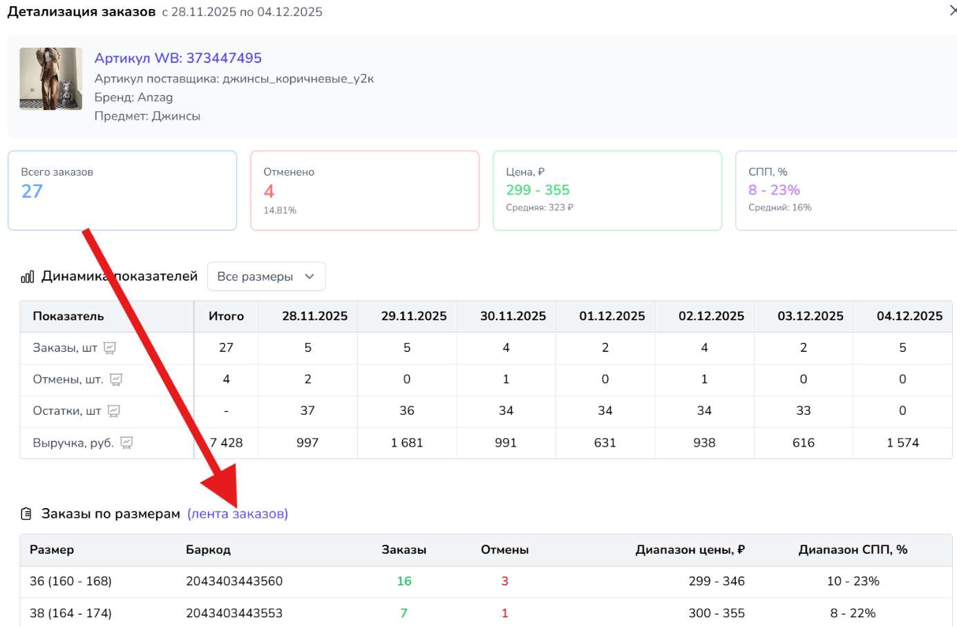 Для просмотра детализации по каждому заказу нажмите кнопку "(лента заказов)".